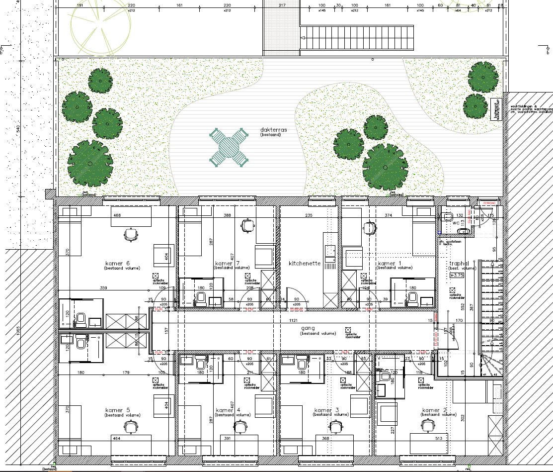 ’t Waskot heeft 6 studentenkamers rond een gemeenschappelijke keuken/eetruimte (kamer 7 en Kitchenette op het grondplan hieronder zijn samengevoegd tot één grote ruimte). Elke kamer is bemeubeld (bed + matras + kussen, bureau, bureaustoel, kast) en heeft en-suite badkamer (douche-wc-lavabo). Er is een gemeenschappelijk, groot zonnig terras 🙂 en breedband WiFi is inbegrepen. Ruime fietsenstalling in het gebouw, wasmachine.